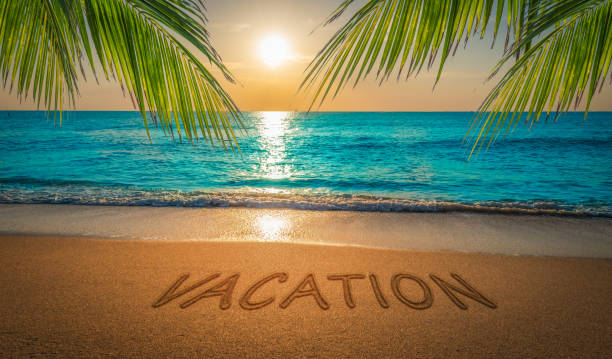 Idyllic sea and beach landscape, vacation written in the soft gold colored sand. Sun reflecting in the sea. Palm branches in front of the image. No people. Summer vacation concept.